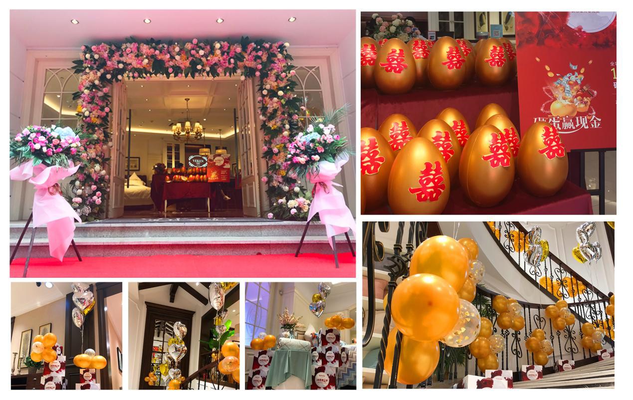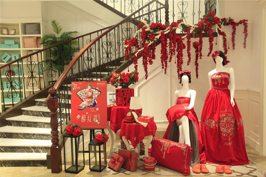 為帶給顧客更直觀舒適的消費(fèi)體驗(yàn),在空間設(shè)計(jì)上,維科家紡和義店二樓婚慶家紡場(chǎng)景展示區(qū)摒棄了家紡行業(yè)傳統(tǒng)高柜+展床的方式,將300余平的空間分隔成7個(gè)實(shí)景樣板間,真實(shí)體現(xiàn)婚慶床品在日常家居生活中的效果,也能滿足顧客在選購婚慶床品的同時(shí),一站式解決對(duì)婆婆禮、長(zhǎng)輩禮以及婚慶小件(子孫桶、火銃、虎頭鞋等)的需求。由于該創(chuàng)意目前在家紡行業(yè)中應(yīng)用較少,可借鑒之處寥寥無幾,公司各部門投入了大量的時(shí)間精力不斷對(duì)方案進(jìn)行修改,力求盡善盡美。整個(gè)二樓還設(shè)置了一大一小兩個(gè)洽談區(qū),都配備了舒適的沙發(fā)以及精致的茶歇,以供顧客能夠坐下來向?qū)з徳敿?xì)了解床品的信息。在陳列布置上,當(dāng)季新品醉紅妝、子孫滿堂、胭脂醉,熱銷品百子納福、麒麟賀滿堂等都被直接鋪設(shè)于房間內(nèi),并搭配生活化的情景道具,供顧客選購。